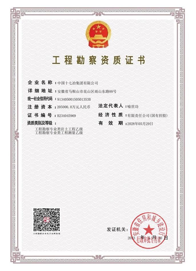 5月30日,经安徽省住建厅批准,中国十七冶成功获得工程勘察专业类岩土工程、工程测量乙级资质。