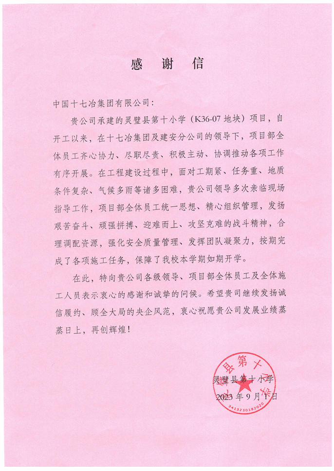 近日,灵璧县第九小学、第十小学分别向中国十七冶集团致表扬信与感谢信,对建安分公司灵璧小学项目部按期完成各项施工任务,保障学校如期开学表示感谢。