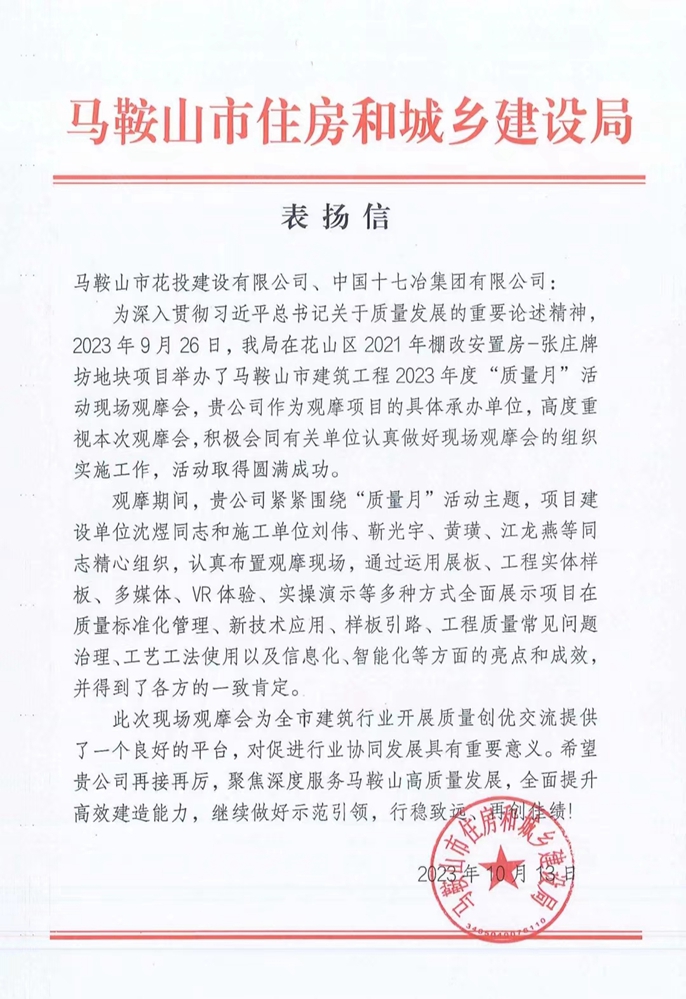 10月13日,马鞍山市住房和城乡建设局向中国十七冶集团致表扬信,对花山片区项目团队积极配合、高效承办马鞍山市2023年度“质量月”现场观摩会表示感谢。