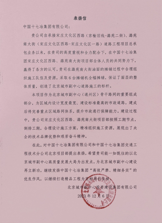 12月6日,北京城市副中心投资建设集团有限公司向中国十七冶集团致表扬信,对交通分公司北京宋庄文化西路、潞苑南大街项目团队齐心协力、攻坚克难,优质高效完成工程节点提出表扬。