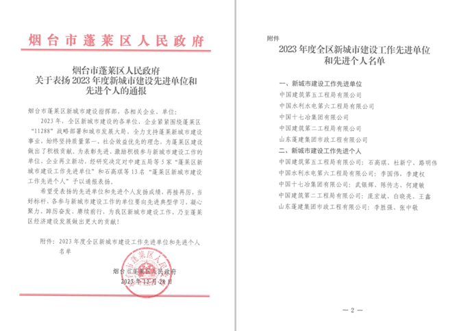近日,山东省烟台市蓬莱区人民政府发布“关于表扬2023年度新城市建设先进单位和先进个人”通报,中国十七冶集团荣获“新城市建设工作先进单位”称号,武银辉、陈传志、何剑敏3位同志荣获“先进个人”称号。