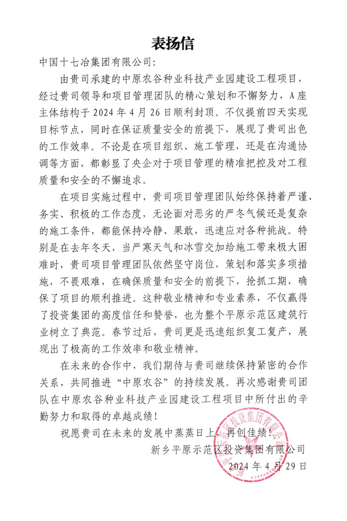 近日,新乡平原示范区投资集团向中国十七冶集团致表扬信,对冶金分公司高效完成中原农谷种业科技产业园首栋单体封顶节点给予肯定。