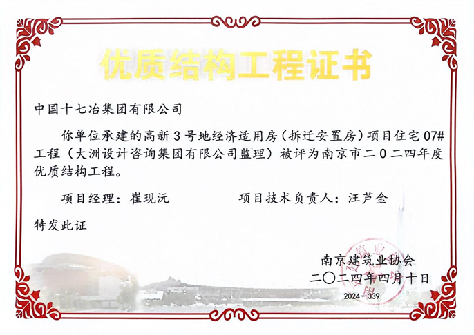 近日,从南京市建筑业协会获悉,中国十七冶江苏分公司承建的南京高新3号地经济适用房(拆迁安置房)项目7#住宅楼、9#住宅楼、S1#商业楼及地下车库4个单体获南京市2024年度优质结构工程奖。