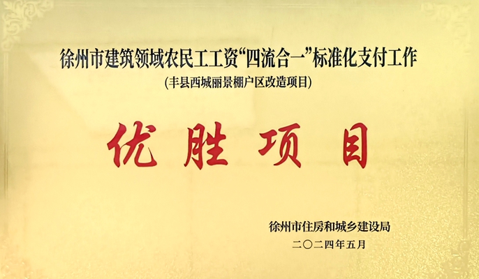 近日,从徐州市住房和城乡建设局获悉,中国十七冶房屋分公司丰县西城丽景棚改项目荣获徐州市农民工工资“四流合一”标准化支付优胜项目,中国十七冶信用评分增加1分,项目劳资员徐泊涵同志荣获优秀劳资专管员称号。