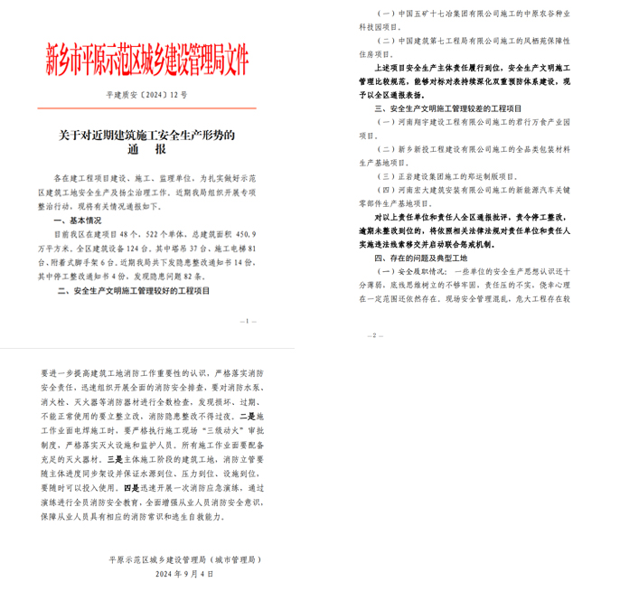 9月4日,新乡市平原示范区城乡建设管理局发布通告,对中国十七冶中原农谷种业科技产业园项目部安全生产工作予以充分肯定。