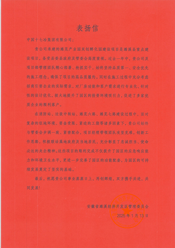 近日濉溪县经济开发区管委会向中国十七冶集团致表扬信,对濉芜产业园双创孵化园项目部在过去一年里心部署、抢抓实干,确保项目高品质履约表示感谢。