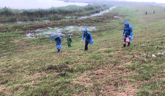 队员们冒雨行走在泥泞的背水坡上,五人一组站成一排,逐段逐段的仔细巡查着坡面,每隔一个小时进行一次排查,不大意不松懈,不错过任意一个可能发生渗漏的点。薄底的胶鞋走在堆满各类尖锐石子的背水坡,脚底生疼,但大家都咬牙坚持,脚底磨出一个个水泡。累了大家就在桥洞底、路边的临时休息点休息一会,简单的吃个午饭,继续巡查。