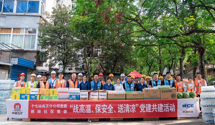 7月14日上午,中国十七冶集团南京分公司党委联合马鞍山雨田社区党委、百年大药房及十七冶医院银塘卫生院组织开展“战高温、保安全、送清凉”共建活动。党员代表们来到马鞍山雨山区雨山街道老旧小区改造项目慰问一线工人,为建设者们送上消暑物品,送去夏日清凉与健康。