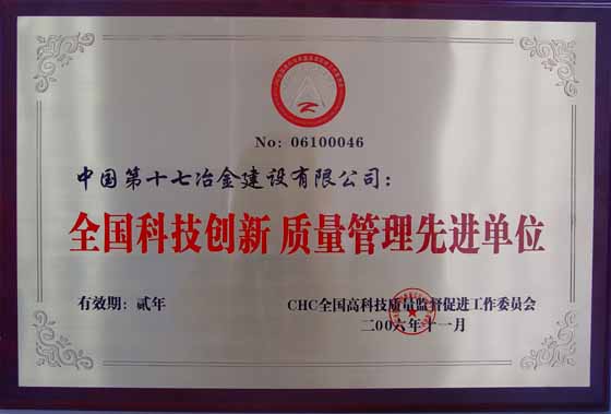 荣获此荣誉标志着中国第十七冶金建设有限公司的科技创新、质量管理水平已上了一个新的台阶,激励着我公司在“发掘不尽的金矿”管理理念指引下不断提升管理水平,为企业创造更大的财富,在“只有起点而无终点的超越”质量理念指引下不断追求卓越,不断增强企业的核心竞争力。