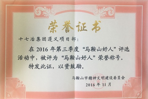 1222日,从马鞍山市精神文明建设委员会传来喜讯,中国十七冶集团交通工程技术公司贵州遵义项目部集体荣获2016年三季度“马鞍山好人”荣誉称号。