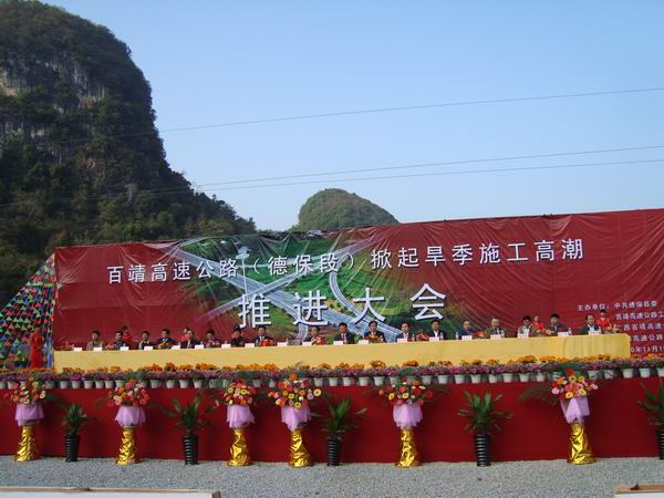 推进大会由中共德保县委、县人民政府、百靖高速公路工程建设指挥部主办,广西百靖高速公路有限公司、百靖高速公路工程总承包部承办。广西交通投资集团有限公司党委副书记、纪委书记罗斯卡、广西交通投资集团有限公司副董事长颜景有、百色市人大常委副主任石卫武、德保县县长牙韩高等领导出席了大会,并对相关工作作出部署和指示。强调各方面务必增加紧迫感和责任感,坚定信心,科学安排,抓紧旱季施工的黄金时机,全面掀起旱季施工的高潮!打好打赢这场攻坚战!上午十时许,石卫武副主任宣布百靖高速(德保段)破土动工,旱季施工的大幕全面拉开。参加大会的还有业主、总监办、各参建施工单位以及群众代表。