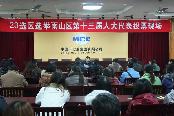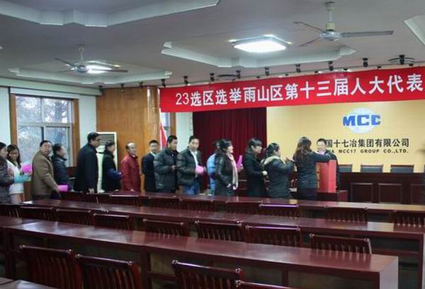 选举大会由路桥公司副经理、党委委员吴同生同志主持召开。会上,吴副经理宣读了选举办法和总监票人、监票人、总计票人、计票人、唱票人名单,介绍了候选人情况。现场加封投票箱后,选举正式开始。参会员工经核验选民证并领取选票后,庄严投下了自己信任的候选人一票。部分远离基地的项目施工人员不能亲自参加投票的,也依照法律程序委托他人代为投票。投票工作从上午8:00持续到14:00,选区内各单位员工分别在各投票分站进行投票,他们以饱满的政治热情,严肃认真的态度,投出了自己神圣的一票,行使公民的政治权利,选出真正代表人民权益、为人民办事的代表,选出自己心目中的“代言人”。 23选区是以路桥工程技术公司为组长单位,由十七冶工程技术服务公司、安徽达成建筑安装工程有限公司、马鞍山市华丰企业公司组成。为做好这次雨山区人大换届选举工作,选区内各兄弟单位进行了精心的筹备,周密部署,密切配合,严把选民登记、资格确认、候选人推荐、投票选举等环节关口,采取多种措施,创造有利于选举人充分表达意愿的条件和环境,保证了这项工作的顺利进行。