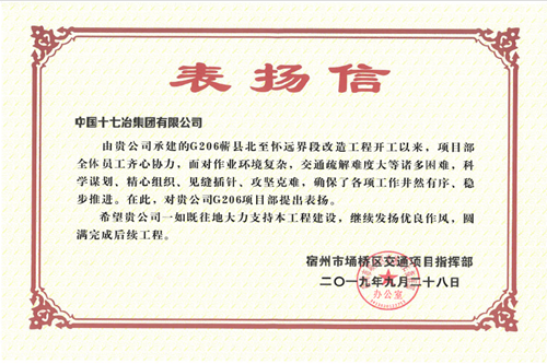 表扬信对G206项目部面对作业环境复杂,交通疏解难度大等诸多困难,科学谋划、精心组织、见缝插针、攻坚克难,确保了各项工作井然有序、稳步推进给予了高度评价。