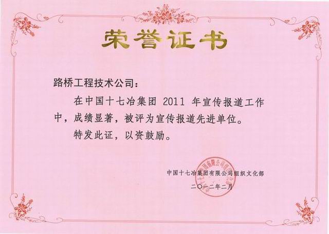 2011年,路桥工程技术公司宣传报道工作紧跟公司发展形势,紧密关注项目最新动态,及时扑捉各种有价值的信息,认真做好公司宣传报道工作,取得了显著成效。2011年公司网站用稿125篇,十七冶集团网站用稿103篇,中冶网站及中冶人等其它报刊完成用稿30余篇。