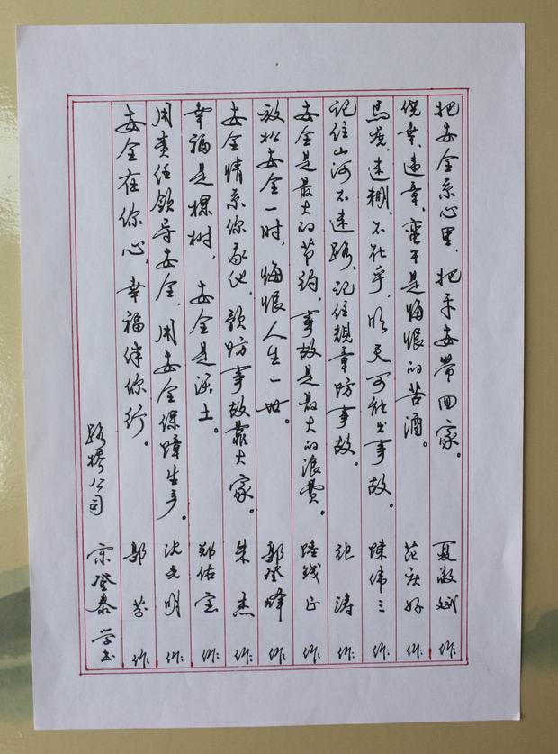 在安全生产警示语征集暨硬笔书法比赛中,公司选送的20条安全警示语,获得一等奖1条,二等奖2条,三等奖5条。在警示语硬笔书法比赛中,宋登泰同志荣获一等奖、新员工郭小庆同志荣获三等奖。