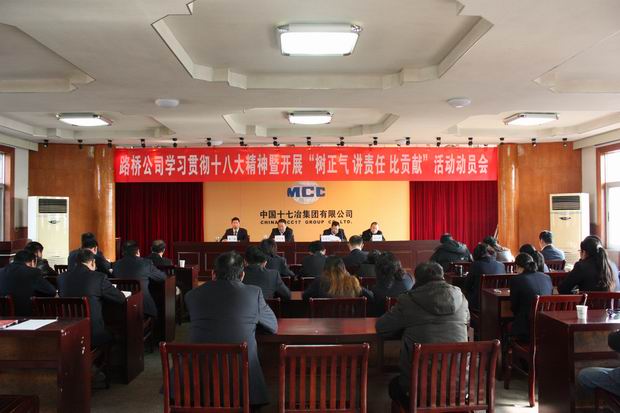 季学武副经理在会上做了动员讲话。他强调指出学习中要在四个方面下功夫:一是要在领会十八大报告理论精髓和精神实质上下功夫;二是要在用科学发展观指导企业发展上下功夫;三是要在紧抓机遇上下功夫;四是要在加强党的建设和班子建设上下功夫。开展“树正气讲责任 比贡献”主题活动要做好以下几个方面工作:一要坚定不移地保持党的先进性和纯洁性,做到秉公行权力、正气拒腐蚀、表率树形象,突出“公道正派”;二要履职尽责创先进、立足岗位争优秀,勤勉工作不推诿、不扯皮,突出“尽职尽责”;三要全面落实公司生产经营目标,脚踏实地,突出“真抓实干”,不断开创各项工作崭新局面,早日实现路桥板块新跨越!