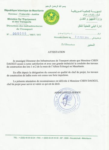 该项目位于西非撒哈拉沙漠地区,高温少雨,沙尘暴等恶劣气候时常发生。项目自开工建设以来,项目经理陈道贵精心组织,科学管理,合理布局,带领全体员工积极克服工期紧、任务重、物资匮乏、自然环境恶劣等各种困难和不利条件,千方百计创造条件,采取措施,不断突破制约施工瓶颈。施工中,积极开展技术创新,改进施工工艺,工程进度多次刷新记录,保质保量的完成业主下达的每一项节点任务,得到了业主和监理工程师的充分肯定。毛里塔尼亚国家基础交通设施部部长、劳动部部长等各方官员先后多次来到项目进行视察,对工程施工质量、进度等给予了高度评价,被认为是国内质量最好的公路。陈道贵在工程建设中以精湛的专业技术和优异的工作表现,赢得了外方的一致好评,也为企业赢得了良好的信誉,唱响了MCC品牌,在撒哈拉沙漠深处添上了一道亮丽的色彩。