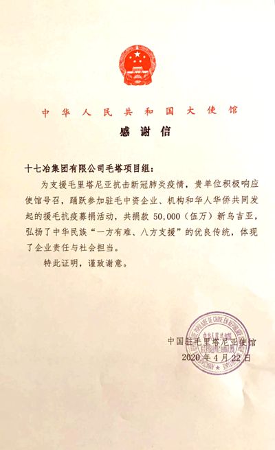 4月24日,中国驻毛里塔尼亚使馆向公司发来感谢信,特别致谢玛嘎玛Maghama-库昂代尔Koundel公路工程项目经理部为支援毛里塔尼亚抗击新冠肺炎疫情积极捐款。