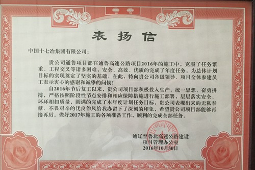 日前,公司承建的内蒙古通辽至鲁北高速公路工程项目收到了业主发来的表扬信,对该项目已圆满完成年度任务目标和总体计划的阶段性节点提出表扬。