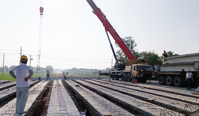 博望河桥上部结构采用预应力混凝土装配式简支T梁,跨径布置3×13m,桥梁角度60°;下部结构采用柱式墩、桩基础,桥台为柱式台、桩基础。全桥包括12片边梁,42片中梁,共计54片梁。