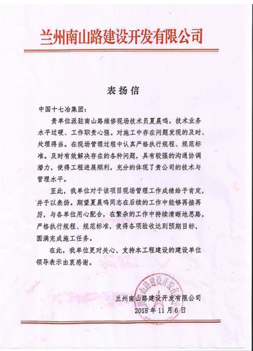 11月7日,兰州南山路建设开发有限公司发来表扬信,对公司兰州区域项目部员工夏晨鸣在负责南山路维修工程施工中取得的良好业绩予以表扬。