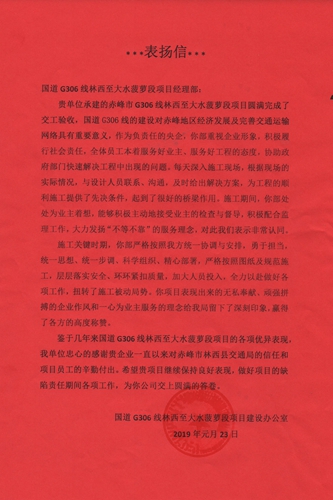 1月24日,内蒙国道306线林西至大水菠萝段项目建设办公室向公司发来表扬信,对赤峰国道306线林西至大水菠萝段项目部在工程建设中做出的突出贡献给予了表扬。