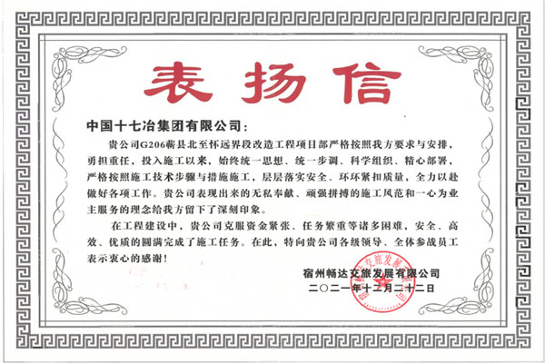 12月22日,宿州畅达交旅发展有限公司向中国十七冶集团致表扬信,对中国十七冶集团路桥工程技术分公司G206蕲县北至怀远界段改造工程项目部积极攻克困难、圆满完成施工任务给予表扬并表示感谢。