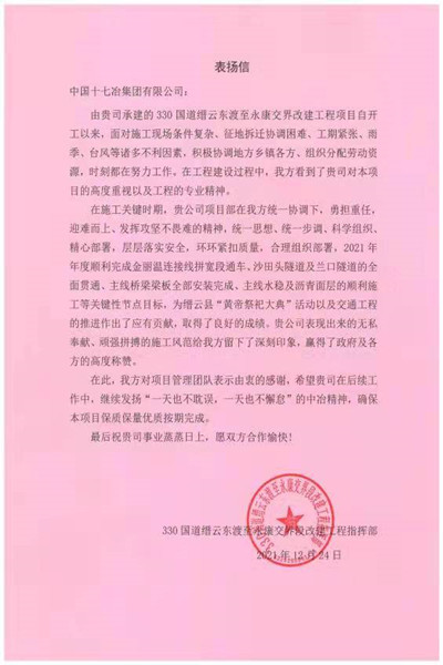 12月24日,330国道缙云东渡至永康交界段改建工程指挥部向中国十七冶集团致表扬信,对公司330国道缙云东渡至永康交界段改建工程项目部克服诸多不利因素、积极推进工程进度提出表扬并表示感谢。