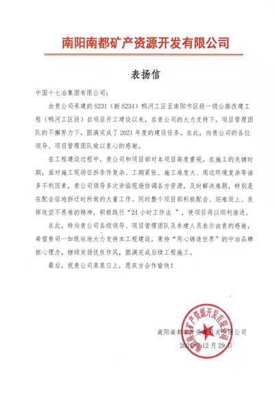 12月29日,南阳南都矿产资源开发有限公司向中国十七冶集团致表扬信,对公司承建的S231(新 S234)鸭河工区至南阳市区段一级公路改建工程(鸭河工区段)项目部圆满完成2021年度建设任务提出表扬并表示感谢。