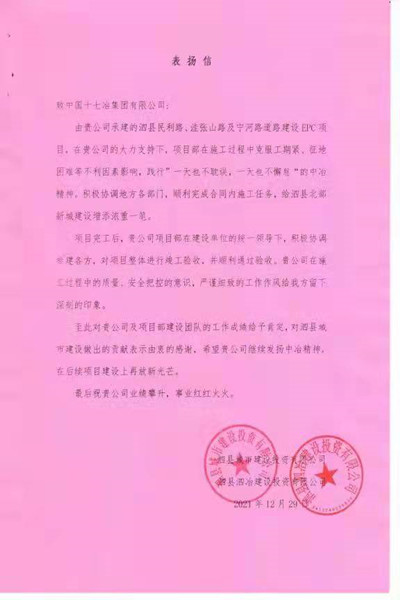 12月29日,泗县城市建设投资有限公司、泗县泗冶建设投资有限公司向中国十七冶集团致表扬信,对公司承建的泗县民利路、洼张山路及宁河路道路建设EPC项目顺利完成合同内施工任务提出表扬并表示感谢。