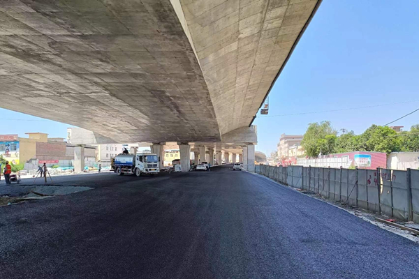 本次沥青摊铺的地面辅道桩号为K0+145-K0+800,全长655米。为确保沥青摊铺施工的顺利进行,项目部高度重视,努力克服工期紧、高温炎热天气等不利因素影响,积极筹划,真抓实干,对施工目标任务进行分解,不断提高施工效率;采用科学的管理方式,合理调配人员及机械设备,规范工艺流程,严格保障施工质量;在摊铺施工中,项目部安全员和技术人员对现场施工人员进行了详尽的安全交底和技术交底,并全程在现场旁站指导,确保施工安全稳定进行。此次沥青摊铺的顺利完成,为后续桥梁主体和剩余辅道沥青铺装施工的进行打下了坚实基础。