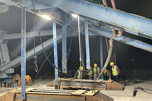 姚站岗南水北调特大桥为跨越南水北调中线干线而设,是整个项目施工难度最大、施工周期最长的关键控制性工程,全桥桥梁由主桥(跨南水北调总干渠)及引桥组成,全长357.2米。为确保施工安全、施工质量,项目部不断优化施工组织方案,按照“先边跨后中跨”的施工顺序,严格执行领导带班制、旁站制,开展夜间巡查,强化重难点部位和关键环节的巡查力度,规范专项技术培训和技术交底,组织现场技术人员全面检查各个零部件以及挂篮的整体状况,并根据现场环境和气温变化的预测,在凌晨2时至4时进行合龙段砼浇筑,施工过程中加强振捣工艺的控制,避免新老混凝土的连接处产生裂缝,同时,边浇砼边同步等效卸载,最大程度减少外部制约。经检测,中跨合龙段轴线偏位、顶面高程、断面尺寸、同跨对称点高程、顶面横坡、平整度等指标均符合设计及规范要求,姚站岗南水北调特大桥成功合龙,为鸭河快速通道卧龙段年底全线通车奠定了基础。项目部将集中力量和资源,确保项目高效率、高标准、高质量按期完成,为南阳人民贡献精品工程和放心工程。
