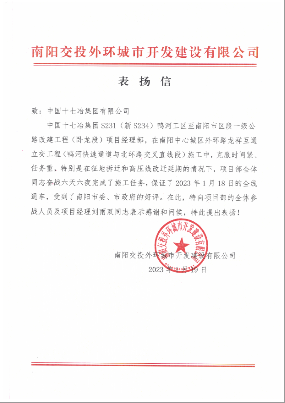 1月19日,南阳交投外环城市开发建设有限公司向十七冶致表扬信,对路桥工程技术分公司S231(新S234)鸭河工区至南阳市区段一级公路改建工程(卧龙段)项目部在南阳中心城区外环路龙祥互通立交施工中高效完成施工任务给予表扬并表示感谢。